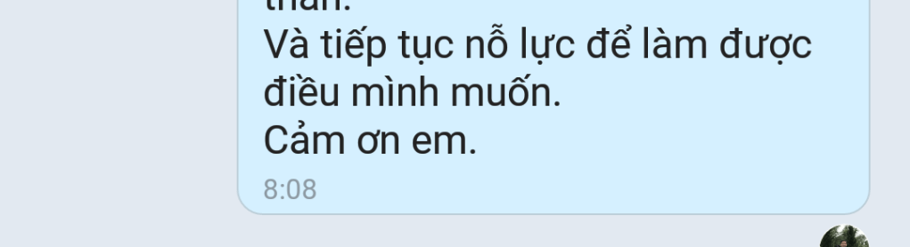 Khi tôi nhắn em check email về thông báo của công ty. Em chỉ hỏi tôi: “Tiền ăn em cần gửi lại không?”, tôi bảo em hỏi bạn bên Hành chính nhân sự giúp chị. Rồi tôi chúc em tiếp tục nỗ lực vì điều bản thân muốn. Tôi cảm ơn em. Em đọc nhưng cũng không rep.
