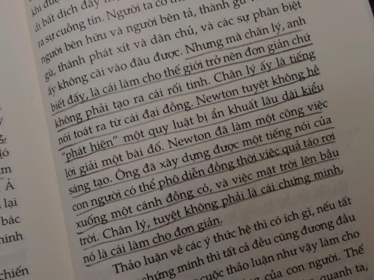“Nhưng mà chân lý, anh biết đấy, là cái làm cho thế giới trở nên đơn giản chứ không phải tạo ra cái rối tinh. Chân lý ấy là tiếng nói toát ra từ đại đồng. Newton tuyệt không hề phát hiện một quy luật bị ẩn khuất lâu dài kiểu lời giải một bài đố. Newton đã làm một công việc sáng tạo. Ông đã xây dựng được một tiếng nói của con người có thể phô diễn đồng thời việc quả táo rơi xuống một cánh đồng cỏ, và việc mặt trời lên bầu trời. Chân lý, tuyệt không phải là cái chứng minh, nó là cái làm cho đơn giản.”