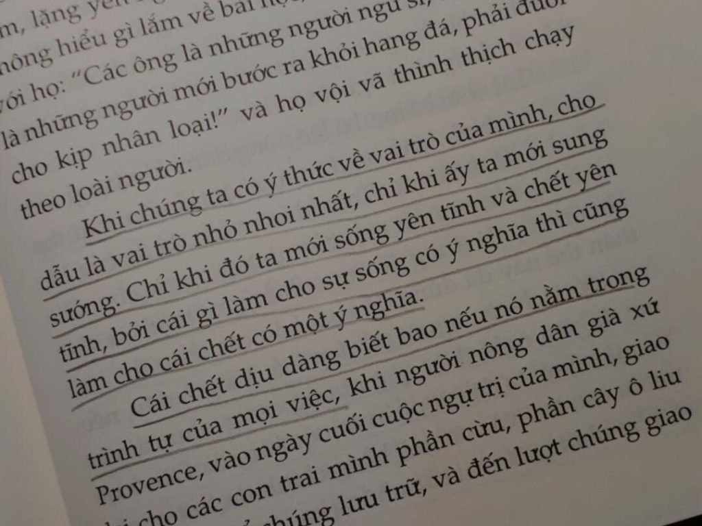 “Đối mặt với cái số phận còi cọc đó, tôi nhớ lại một cái chết khác xứng là cái chết của con người. Cái chết của một người làm vườn từng nói với tôi: ‘Anh biết chứ… đôi khi đang đào xới, tôi chảy tháo cả mồ hôi ra! Chân bị rút vì bệnh khớp, tôi nguyền rủa cái nghề đào xới. Thế mà nay tôi thích đào xới, đào xới đất. Được đào xới đất, thật thích. Khi ta đào xới, ta tự do biết bao! Và rồi, rồi đây, ai chăm các cây cối cho tôi nữa?’ Ông để lại một quả đất đang đào xới dở. Ông để lại một hành tinh đang đào xới dở. Bằng tình yêu, ông gắn bó với tất cả các vùng đất, với tất cả mọi cây cối trên Trái đất. Chính ông mới là người hào phóng, là kẻ hoang phí, là ông chúa lớn.“