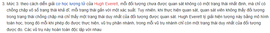 Tôi không định nói về vấn đề này, tôi chỉ mượn nó để kể chuyện, tôi không cố để tỏ ra nguy hiểm :)))) Vậy trong trường hợp diễn giải trên là ĐÚNG, vậy có nghĩa, mỗi sự lựa chọn của chúng ta (tương ứng với một xác xuất cụ thể), vũ trụ phân nhánh. Cụ thể nữa thì có nghĩa là, ở vũ trụ này, tôi cho rằng diễn giải này đúng. Nhưng hoàn toàn có khả năng là tôi cho rằng diễn giải này sai, khả năng này nằm ở một vũ trụ khác (thực tại khác).
