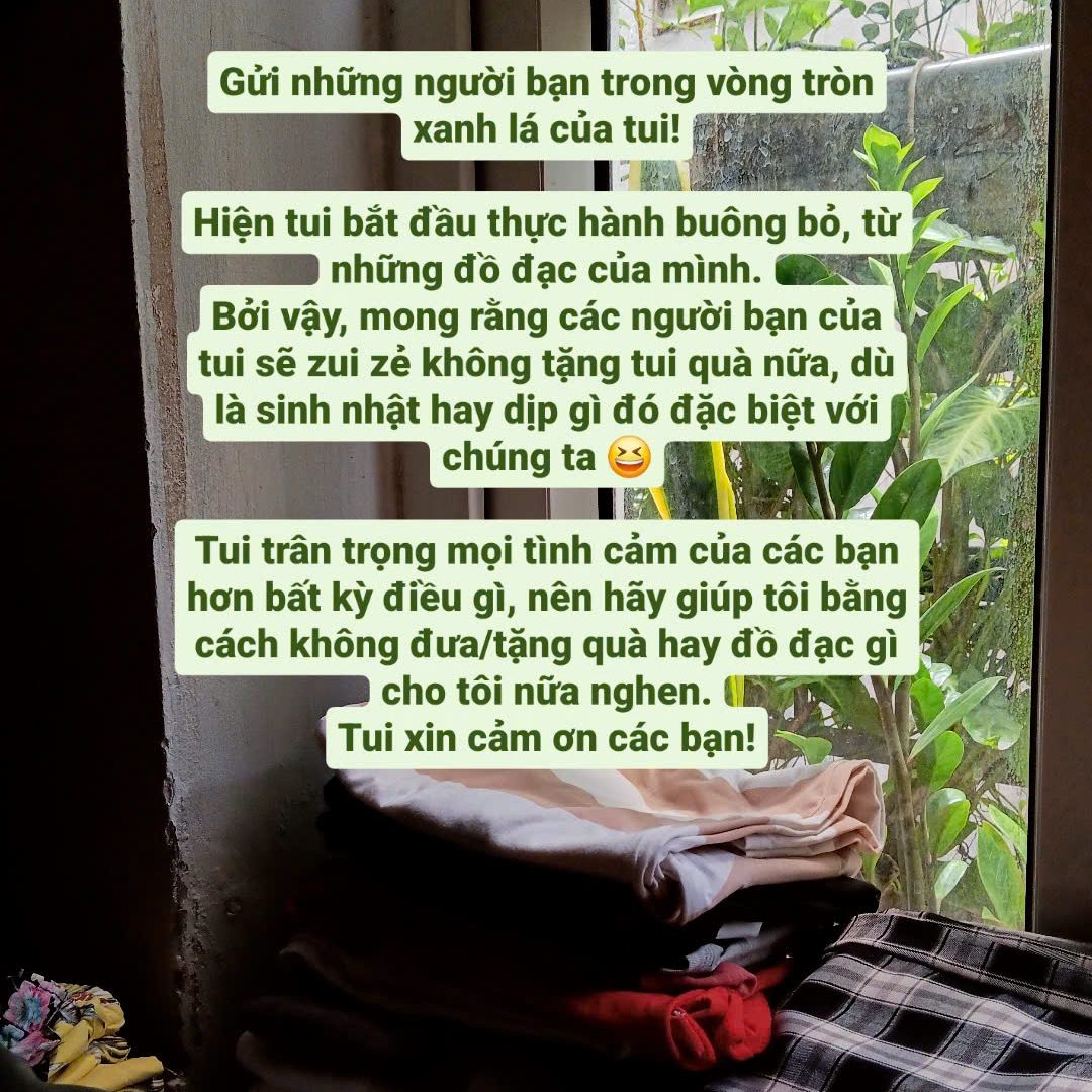 Việc đầu tiên tôi quyết tâm làm trong những ngày thất nghiệp của mình là đóng gói và cho đi những gì không cần thiết. Rất nhiều quần áo, đồ đạc, sách… đã được cho đi mà tôi thấy trong mình chẳng có một tiếc nuối gì. Tôi thấy mình cần quá ít để sống được và những ham muốn sở hữu thêm gần như đã không còn nhiều. Nhờ thế mà tết này tôi chẳng có gì để dọn dẹp trong phòng, mọi thứ đã được tối giản đi rất nhiều, và tôi thấy nhẹ nhõm cùng bình thản hơn.