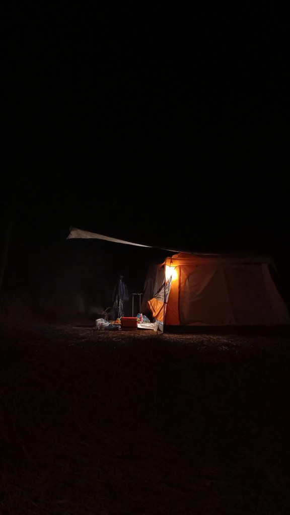 Khi tối thì trời ngớt mưa. Nhưng cả quả đồi có mỗi chúng tôi nên bên phía chủ thuê cũng không thèm cắm đèn đóm gì. Ngồi từ mái lều nhìn ra ngoài kia tối đen như mực. Chúng tôi phải soi đèn để dắt nhau xuống nhờ anh chị lên cắm đèn, và xin thêm mấy cái chăn. Đêm đó sẽ lạnh.